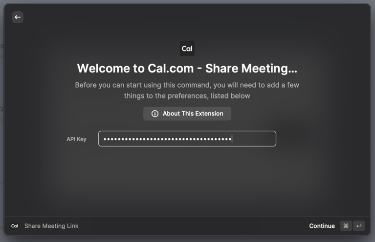 Quickly share your Cal.com meeting links with Raycast. Requires Raycast.com to be installed and the Cal.com from the Raycast Store needs to be installed: https://www.raycast.com/cal/. You can create an API token in your Developer Cal.com Settings, and then you can add the API Key by opening up the Cal.com App in Raycast.